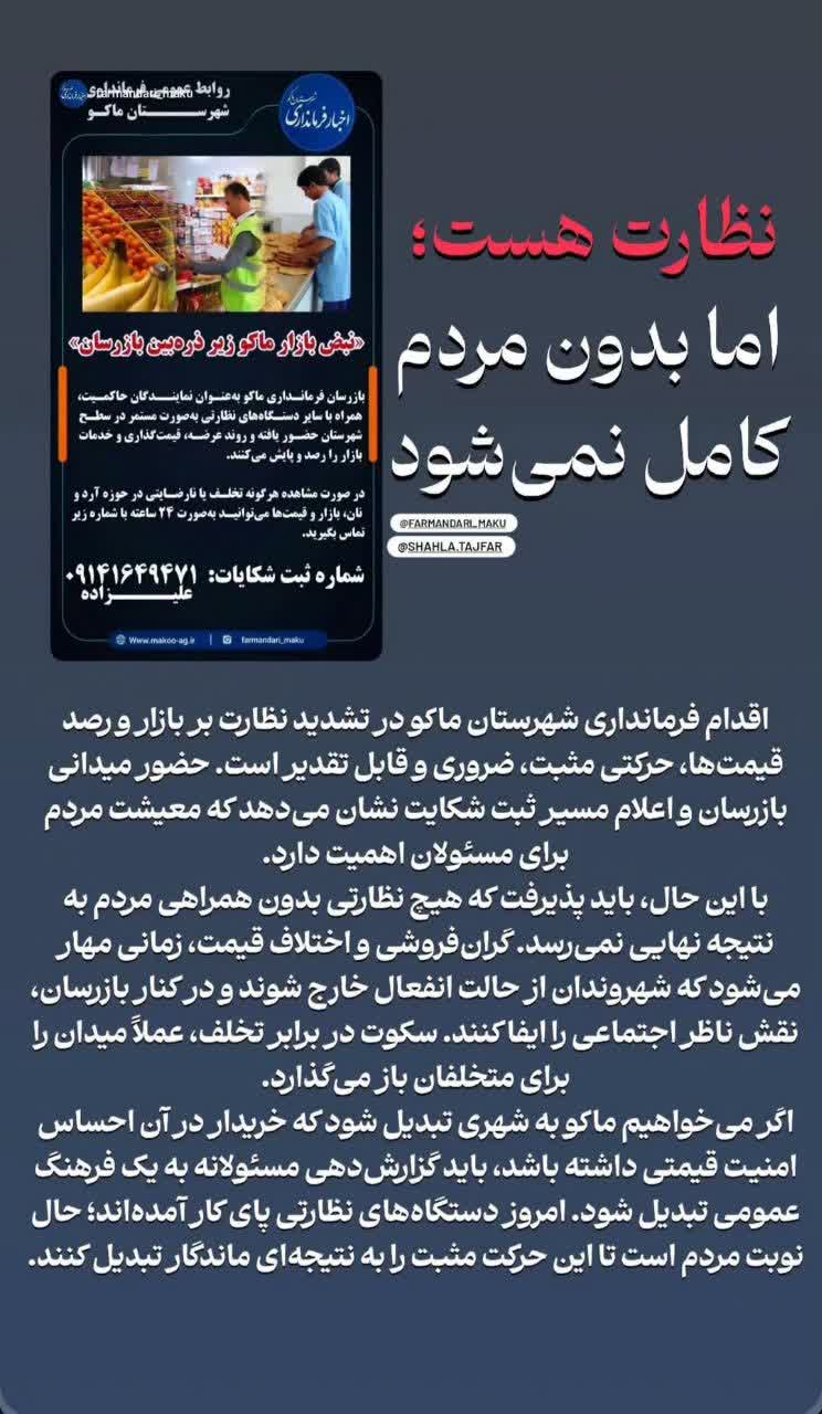 به گزارش روابط عمومی شبکه دامپزشکی شهرستان ماکو،خانم شهلا تاجفر، فرماندار محترم شهرستان ماکو، به همراه جمعی از مسئولان اجرایی این شهرستان از بازارهای محل عرضه محصولات غذایی بازدید و قیمت‌ها و کیفیت کالاها را به صورت میدانی رصد نمودند. در این بازدید، کارشناسان و مسئولان شبکه دامپزشکی شهرستان ماکو نیز در معیت فرماندار حضور داشتند و ضمن همراهی با ایشان، نظارت تخصصی بر وضعیت بهداشتی فرآورده‌های خام دامی و شرایط نگهداری آن‌ها را به عمل آوردند. این اقدام مشترک، نشان‌دهنده اهمیت موضوع سلامت غذایی و نظارت بر بازار در دستور کار مدیریت ارشد شهرستان و همراهی و تعامل سازنده دستگاه‌های نظارتی از جمله شبکه دامپزشکی برای تحقق این هدف است. ۱۴۰۴.۰۹.۲۸ روابط عمومی شبکه دامپزشکی شهرستان ماکو