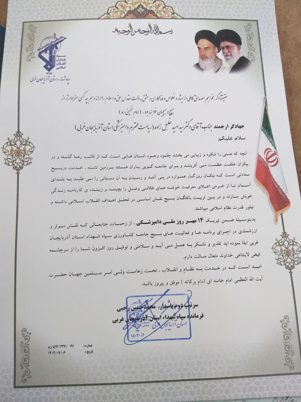هم زمان با هفته دامپزشکی و گرامیداشت ۱۴ مهر روز ملی دامپزشکی در راستای نقش موثر و ارزشمند دامپزشکی در اجرای برنامه ها و فعالیت های بسیج جامعه کشاورزی سپاه شهدا استان لوح تقدیری از طرف سرتیپ دوم پاسدار محمد حسن رجبی فرمانده سپاه شهدا استان آذربایجان غربی به سید امید خلیل زاده مدیرکل اهدا گردید