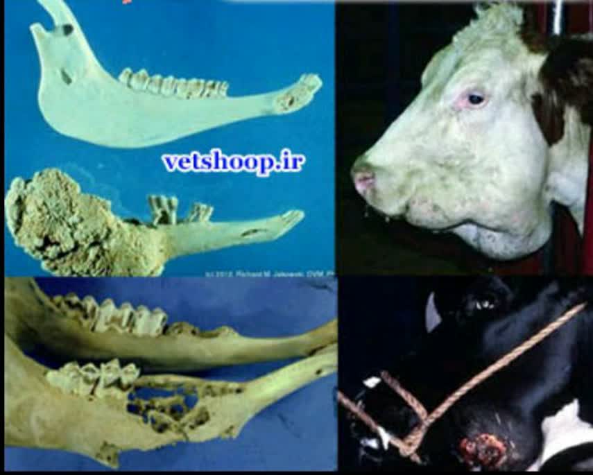 اکتینومایکوز در گاو شایع تر است، اگرچه گاهی اوقات در خوک اسب هم مشاهده می شود. این بیماری معمولا در گاوهای بالغ جوان، تک گیر می باشد و می تواند در گوساله ها نیز رخ دهد اگرچه وقوع آن به صورت انفرادی است ولی به دلیل گستردگی زیاد و پاسخ ضعیف به درمان حائز اهمیت می باشد. از مشخصه بیماری استئومیلیت استخوانهای سر بخصوص فک هاست که منجر به تغییر شکل آنها می شود. ( Actinomyces Bovis )اکتینومیسس بوویس یک جرم گرم مثبت و رشته ای مانند است. این باکتری در اثر آسیب ناشی از مواد خشبی به مخاط فک و یا از طریق آلوئول های دندانی در اثر افتادن دندان به بافت حمله می کند. باکتری بیشتر بافتهای سخت مثل فک و گونه ها را مبتلا میکند. اصلی ترین ضایعه آن آماس گرانولوماتوز چرکی است.باکتری عامل بیماری جزء فلور طبیعی دهان است، تشخیص تفریقی : بیماری را می بایست از جراحات حاصل از اکتینوباسیلوز، استافیلاکوک تفکیک داد. اکتینوباسیلوز گرم منفی و اکتینومیکوز گرم مثبت است. اکتینومیسس بوویس شدیدا" در برابر آنتی بیوتیک های بتا لاکتام حساس است ولی در برابر تتراسیکلین ها، کلرامفنیکل و ماکرولیدها حساسیت نسبی دارد. قضاوت لاشه : در موارد آکتینومیکوز و آکتینوباسیلوز ضبط موضی انجام می گردد، یعنی اعضاء آلوده از مصرف خارج شده بفیه لاشه قابل مصرف می باشد. اما در صورتیکه بیماری عمومی شده باشد کل لاشه حذف میگردد. (مورد فوق در کشتارگاه دام ارومیه تشخیص داده شد)